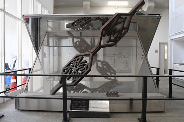 このオブジェは、超平面仕上げ加工した18-8ステンレス鋼板を用いて新日本製鐵から寄贈された
