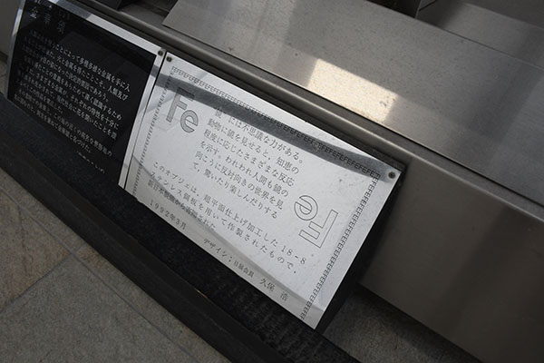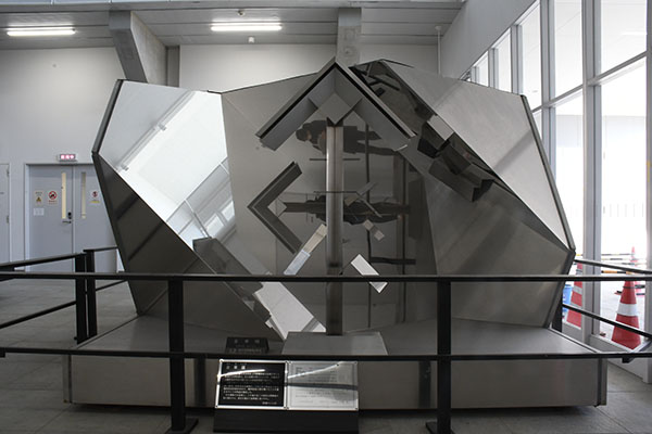 このオブジェは、超平面仕上げ加工した18-8ステンレス鋼板を用いて新日本製鐵から寄贈された