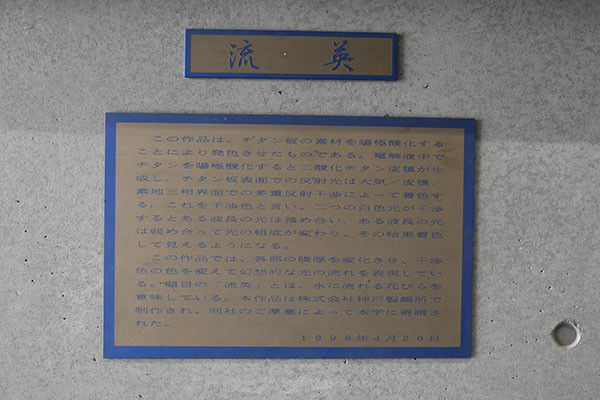 この作品では、各部の膜厚を変化させ、干渉色の色を変えて幻想的な光の流れを表現している。題目の「流英」とは、水に流れる花びらを意味している。