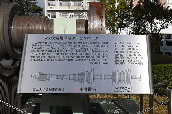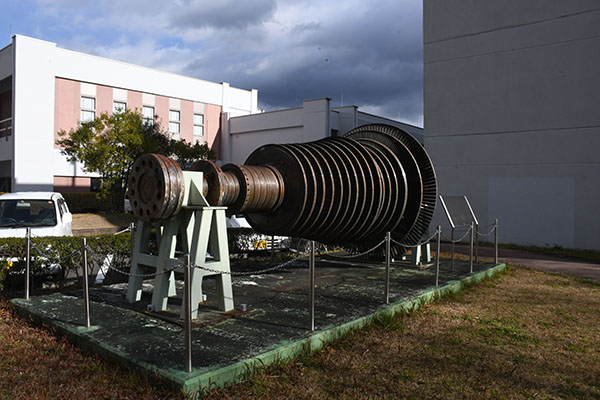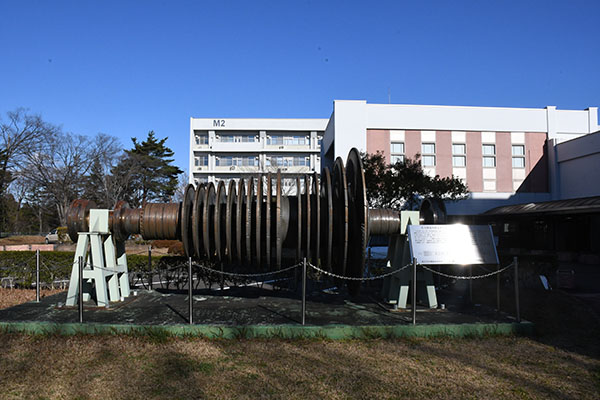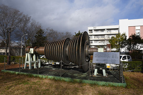 展示品は中央の中・低圧ロータです。同発電所には同型の3台のタービンがあり、1号機は米国GE社製、本2号機と3号機は日立製作所製です。