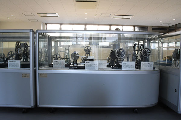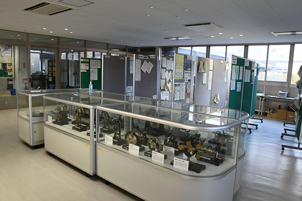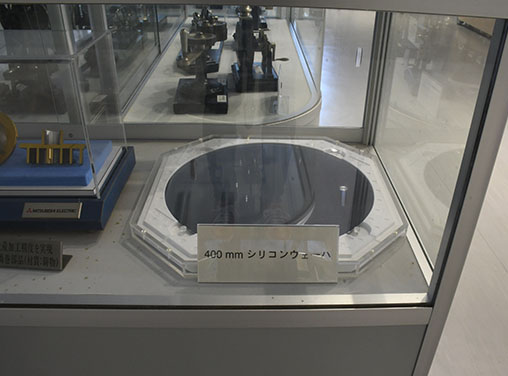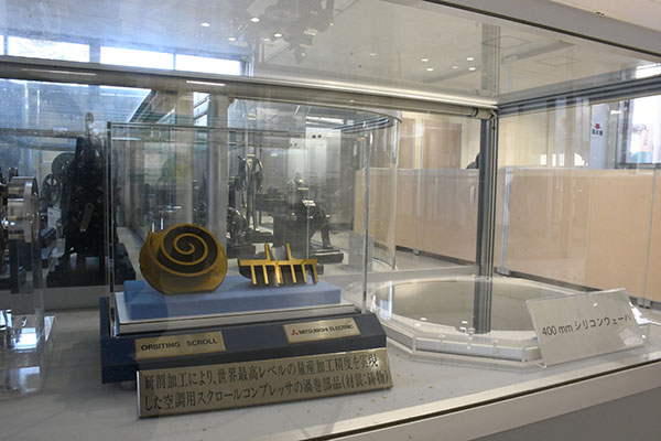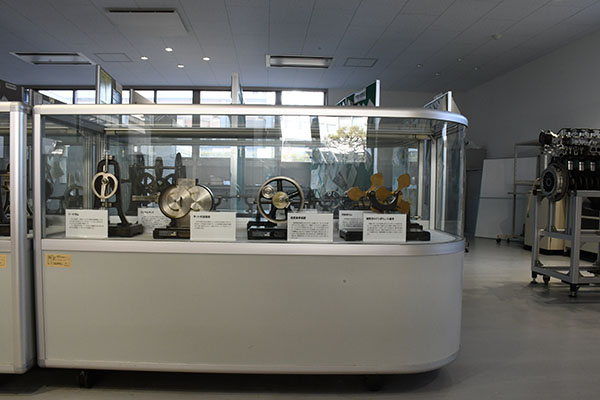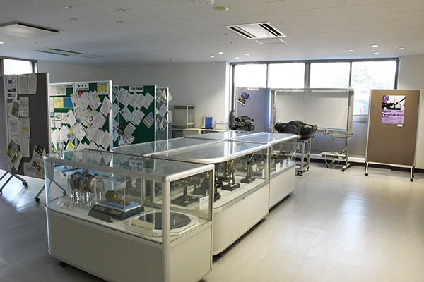 公開施設、記念碑等 機械工学科 展示スペース 400mmシリコンウェーハや世界最高レベルの量産加工精度を実現した空調用スクロールコンプレッサの渦巻部品、様々なカムや歯車等を展示 アクセス A02 機械系 講義棟 1F
