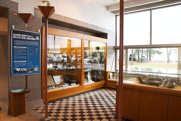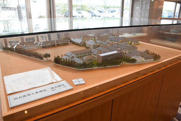 東北大学工学部の前身の1つである旧仙台高等工業専門学校(SKK)の歴史的関係についてや、復元模型など展示