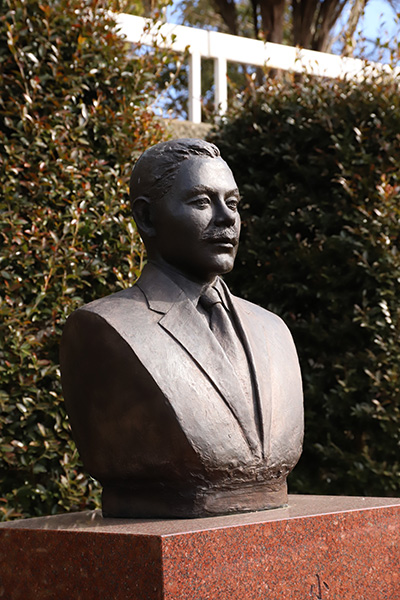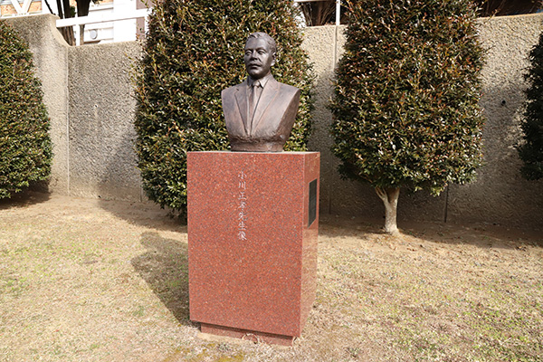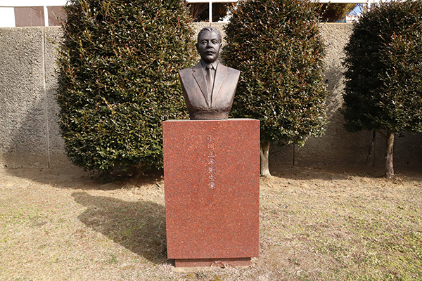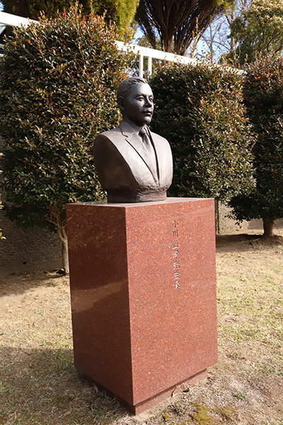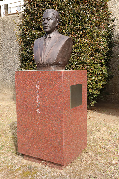 青葉山北キャンパスの中央広場奥に、東北帝国理科大学教授、初代東北帝国大学理科大学学長、第四代東北帝国大学総長を務めた小川正孝先生(1865-1930)の銅像が鎮座しています。小川先生は、理学部化学科無機化学講座教授として、研究・教育に邁進され、1908年には、「ニッポニウム」の発見を報告されました。のちに否定されるものの、現在の「レニウム」(原子番号75、1925年にNoddackほかにより発見)という新元素であったと再評価されています。この銅像は、旧財団法人東北大学研究教育振興財団が理学部創立百周年を記念して寄贈したもので、当時財団理事長の西澤潤一名誉教授(1926-2018)の発案によるものです。小川先生に関する記念物として、片平キャンパスの一角に小川記念園があります。