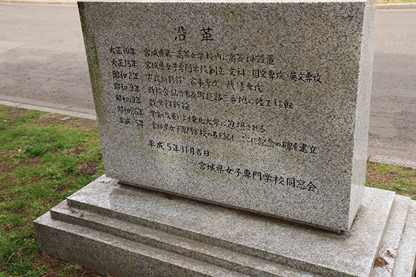 平成5年 宮城県女子専門学校の名を記し、ここに記念の碑を建立