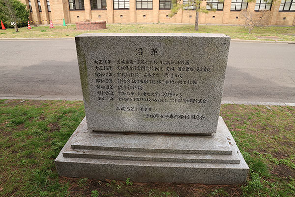 1926年(大正15年)に創設された宮城県女子専門学校の記念碑。日本の公立では3番目の女子専門学校として設立。学制改革で東北大学に併合され、 農学部家政学科となりました(生活科学科と改称後、1960年(昭和35年)廃止)。