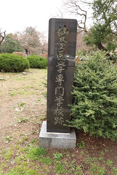 公開施設、記念碑等 片平丁校舎 「第二高等学校」「第三臨時教員養成所」「仙台医学専門学校」の木看板が並んで架けられている。 仙台医学専門学校 藤野教授室 仙台医学専門学校 藤野教授室 仙臺医学専門学校跡 1901年(明治34年)に創設され、魯迅も学んだ仙台医学専門学校の記念碑。1912年(明治45年)に東北帝国大学に包摂され医学専門部となり、その後東北帝国大学医科大学が 設置されました。 関連情報 魯迅先生の像 https://www.bureau.tohoku.ac.jp/center/katahira-001.html アクセス D 学都記念公園