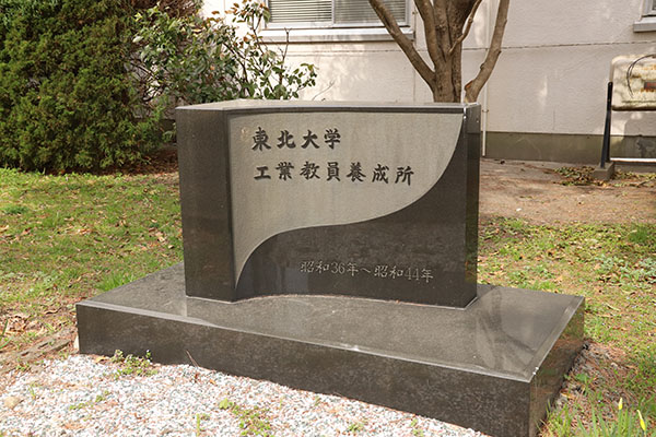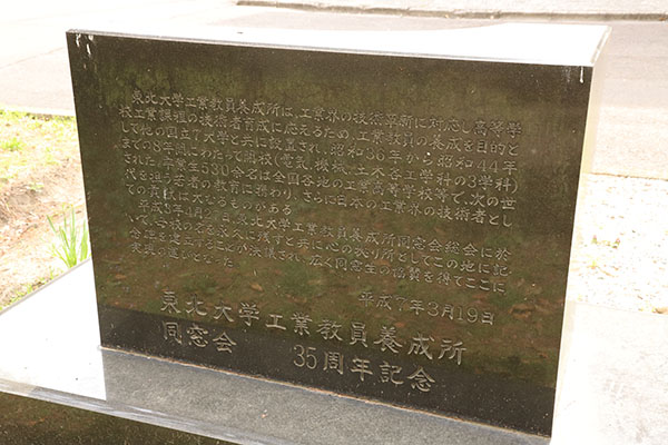 工業界の技術革新に対応し高等学校工業課程の技術者育成に応えるため、工業教員の養成を目的として他の国立7大学と共に設置され、 1961年(昭和36年)から1969年(昭和44年)までの8年間にわたって開校(電気・機械・土木工学科の3学科)された東北大学工業教員養成所の記念碑。