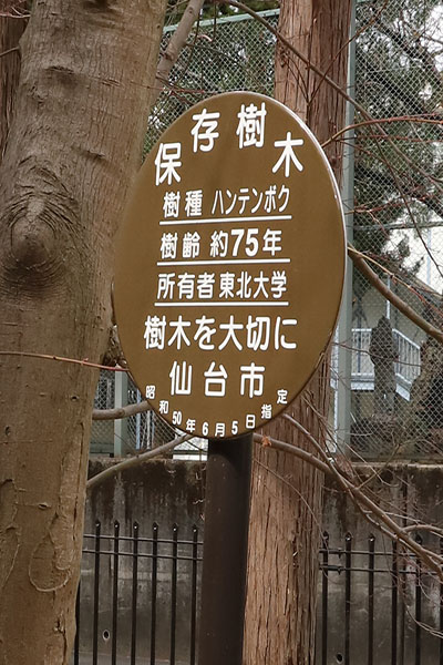 公開施設、記念碑等 保存樹木 ハンテンボク ユリノキ 別名ハンテンボク(葉の形が半纏に似ていることから) 樹齢約75年 樹高22.0m 幹周2.1m 1975年(昭和50年)6月5日仙台市の保存樹木に指定されています。 アクセス A19 東北大学本部棟7 入口付近