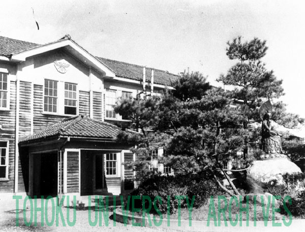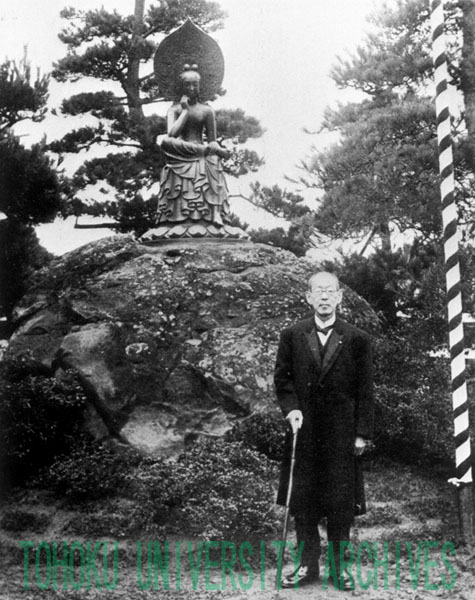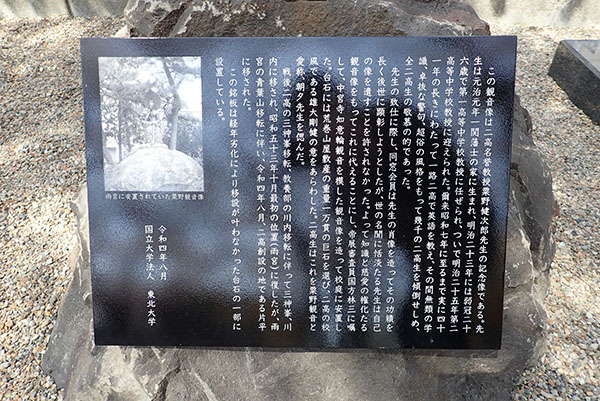 この観音像は二高名誉教授粟野健次郎先生の記念像である。先生は元治元年一関藩士の家に生まれ、明治二十三年には弱冠二十六歳で第一高等中学校教授に任ぜられ、
