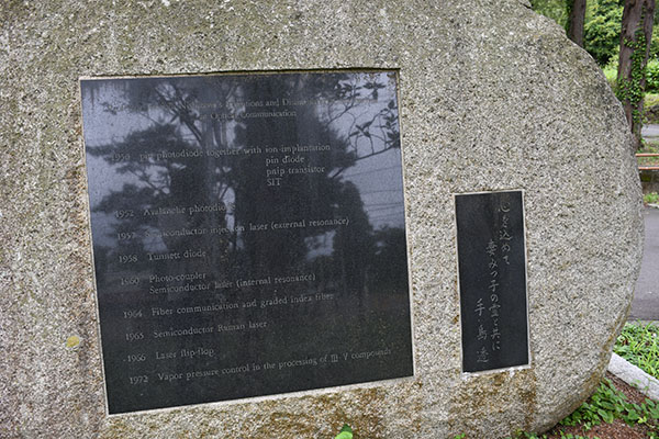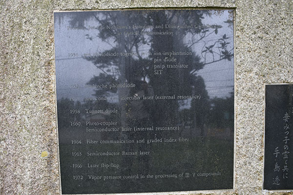 西澤氏が所長を務めた電気通信研究所内の敷地にある「光通信発祥の地」の碑。 光通信関連の業績を讃えて, 元スタンレー電気社長の 手島透氏によって 建てられました。同様の碑が川内キャンパスの旧半導体研究所敷地内にもあります。
