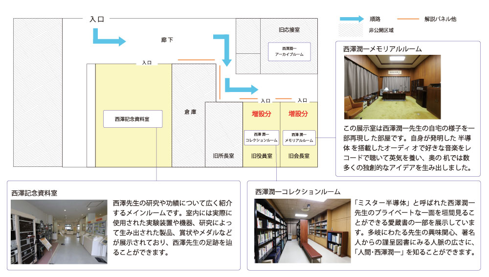 旧半導体研究所には、西澤先生と半導体研究所に関係する実験機器などを展示し、研究成果などを紹介する「西澤記念資料室」が整備されています。