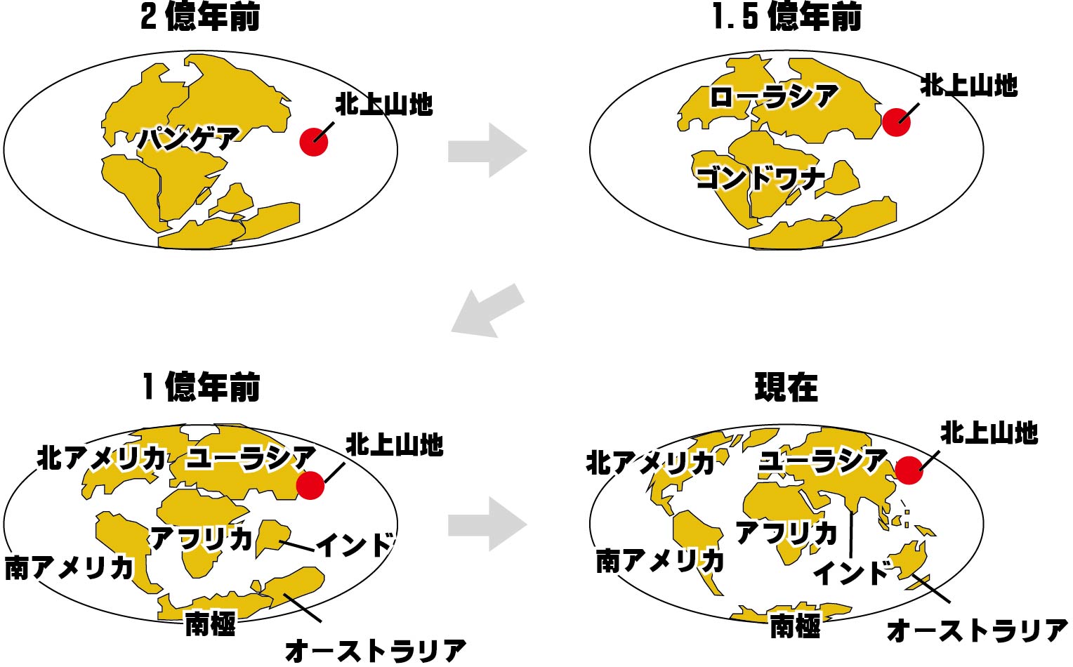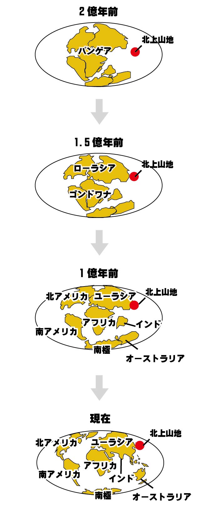 北上山地や阿武隈山地は元々ゴンドワナ大陸の縁辺部にあり、それから長い時間をかけて現在の場所まで北上しました。大雑把にいうと、2億年くらいかけて、赤道から現代の北緯35度から40度くらいまで移動してきたのです。