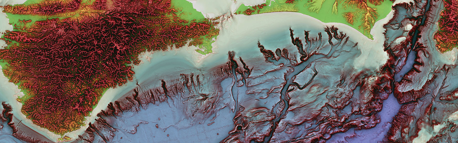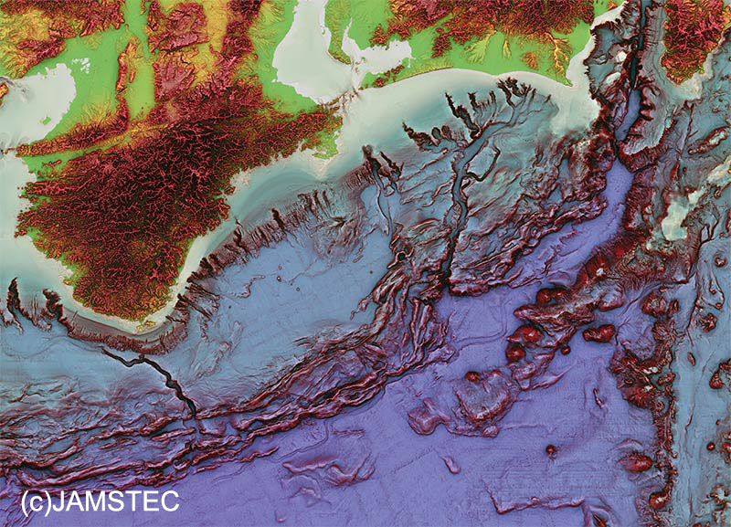 斜度を赤色にすることで地形の起伏が強調され、陸上の土砂が海底谷を乱泥流となって遠くまで運ばれていることがわかります。