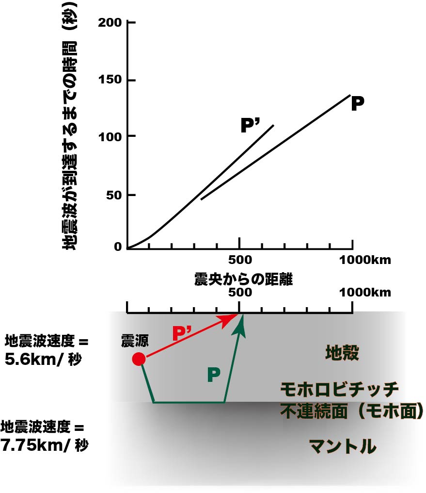 PとP’の傾きを比較すると、同じ時間(縦軸)で、マントルを通過するPの方がより遠くへ地震波が到達している