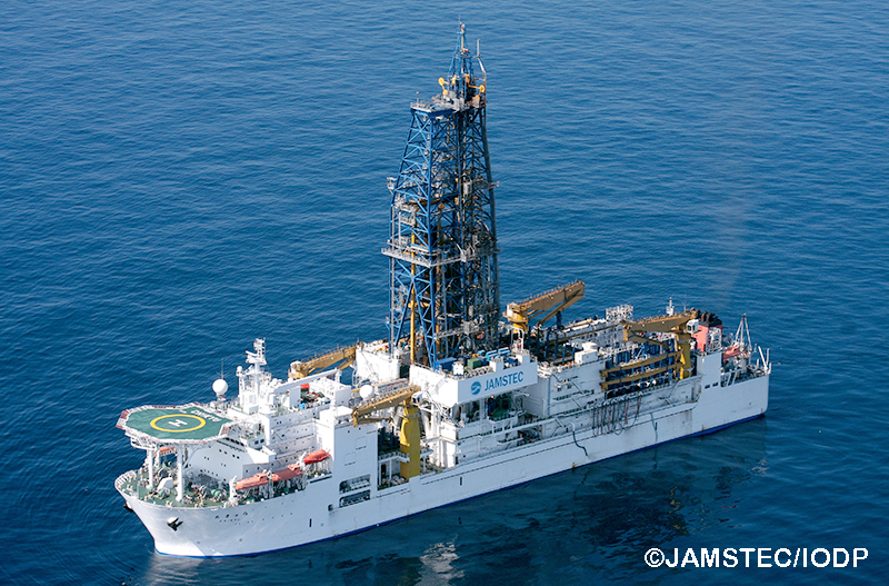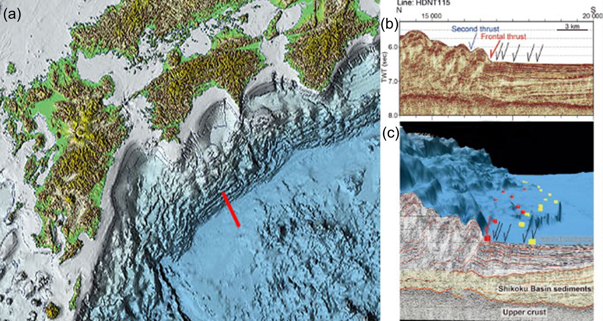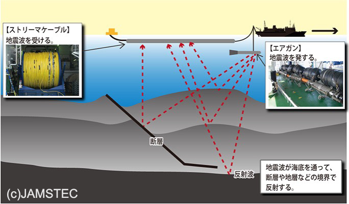 深海底下の構造探査方法。(a)調査場所を示す(赤い線)(b)海底下構造探査図