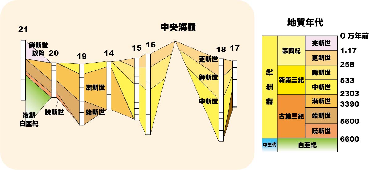 中央海嶺から離れるほど古い地層が分布(数字は上記地図の掘削地点を示す)
