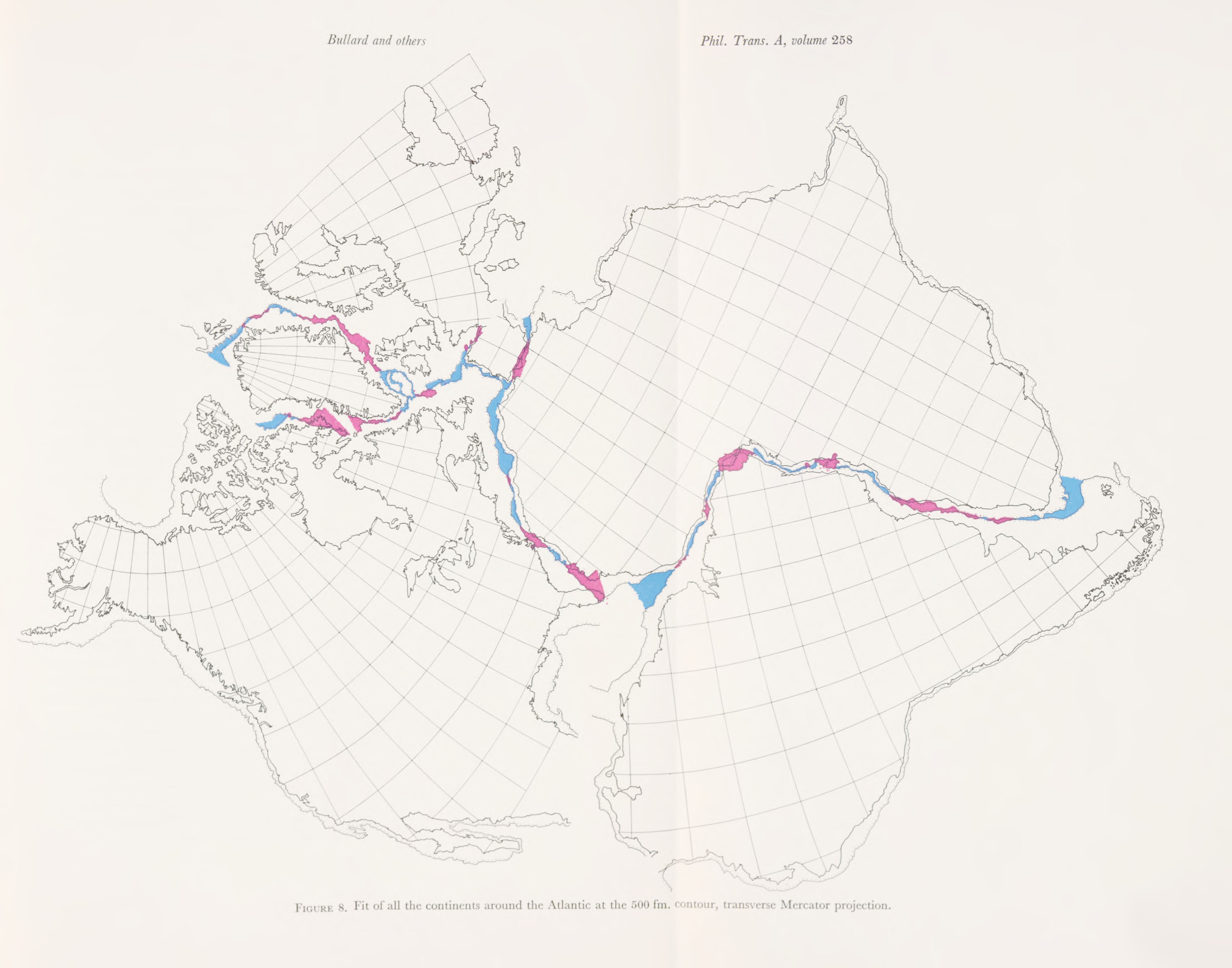 Bullard, S.E., et al., 1965, The fit of the continents around the Atlantic, vol. 258, No. 1088, A Symposium on Continental Drift (Oct. 28, 1965),Volume 258Issue 1088 pp. 41-51 , Royal Society.