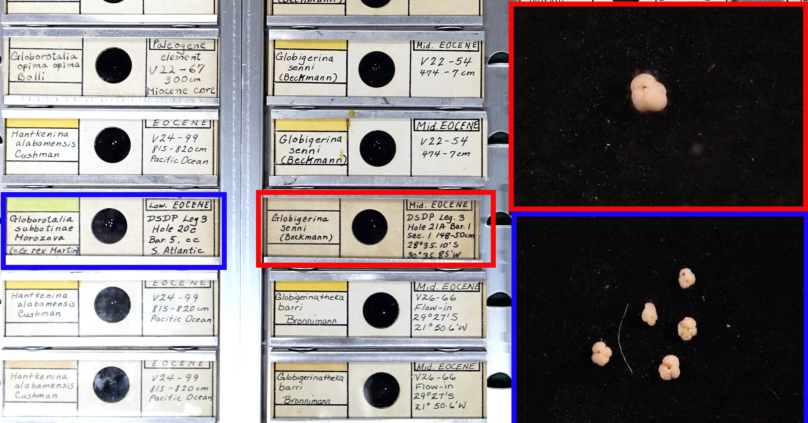 斎藤コレクション:東北大学に保管されている深海掘削計画(DSDP)第3次研究航海で得られた有孔虫サンプル(赤および青で囲んだサンプル。右側は有孔虫の拡大写真)。