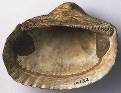 箱型のかたち。太くて角張った放射肋。一列に並んだ細かい多数の歯。殻頂の下に広く平らな靱帯面があり、やま型ないし波型の溝が刻まれている。 |