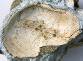 なすび型。右殻の方が左殻よりも扁平。小さいながらも、ねずみの歯のように突出した2つの主歯がある。殻頂の後方に歯丘があり目立つ。(現生標本であれば、殻は青紫色を呈する。) |