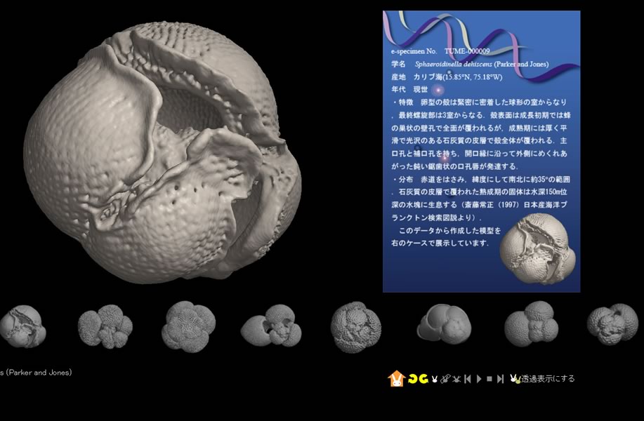 総合学術博物館では、保管されている学術資料標本を三次元デジタルコンテンツとして提供することが博物館の将来の重要タスクになると考えて、1998年よりマイクロフォーカスX線CT技術による標本のデジタル化技術の開発、2004年からはデジタル標本「e-Specimen」の開発、2008年から浮遊性有孔虫デジタル標本データベース「e-Foram Stock」の試験公開とデジタル標本の開発を続けてきました。