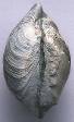 殻は大きくて三角扇形。厚い。ハート形の小月面がくっきり深く刻印されている。主歯は3つ。側歯はない。小月面の咬合部が鋸歯状になっている。内面腹縁は細かい刻み目がついている。套線湾入は小さな三角形。また、殻の外側が磨耗あるいは溶けると、細い放射脈のような模様が顕著に現れる。 |