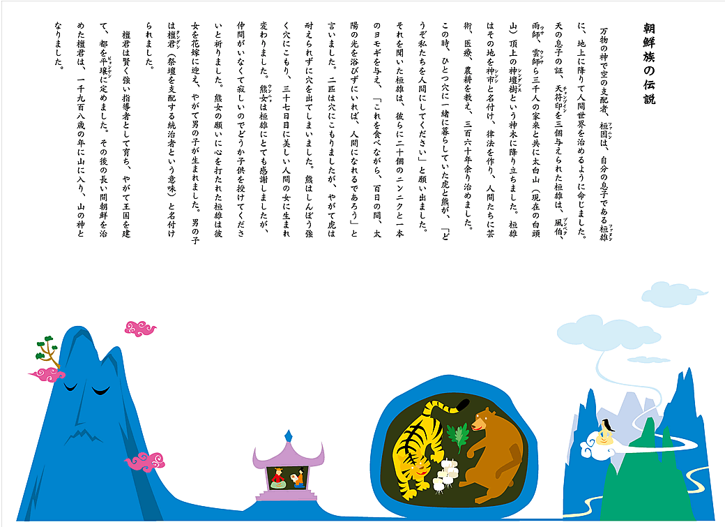 朝鮮族発祥の地としての白頭山伝説では、朝鮮族の祖とされる檀君(タングン)は、天から遣(つか)わされた桓雄(ファヌン)の子として、白頭山で生まれたとされています。檀君はやがて王国を建てたとされ、韓国・朝鮮ともに教育にとりいれられています。韓国では、檀君が即位したとされる紀元前2333年を元年とする檀君紀元(檀紀)を定め、1961年まで公的に使用されていました。