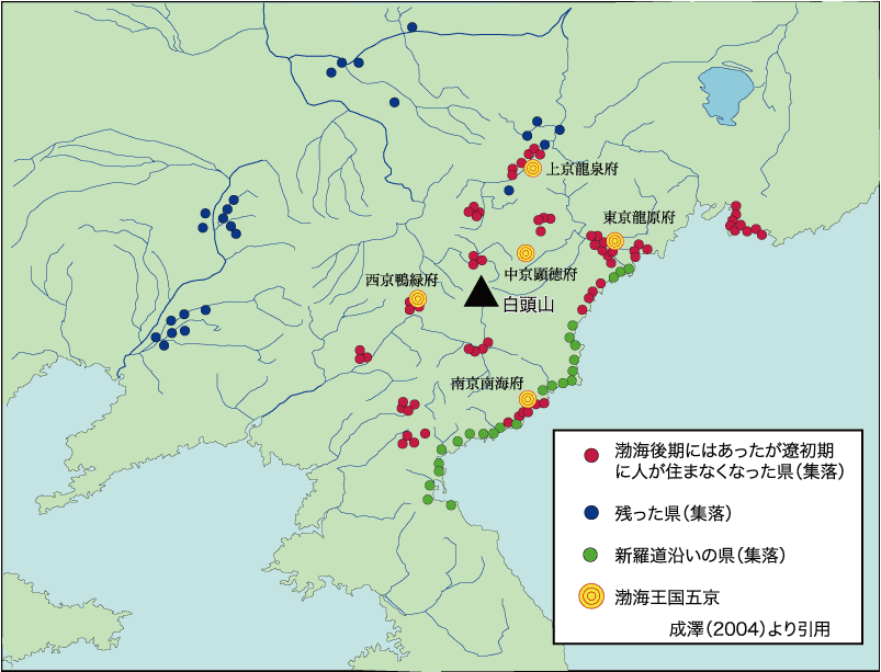 古文書をもとにして、渤海王国の末期と遼王国の初期の間で、人が住まなくなってなくなった集落(県)と残存した集落とをひろいだすと、火砕流の分布地域や山の南東側で厚い火山灰や軽石で埋められた地域で、なくなった集落が目立っていることに気がつきます。また、直接噴出物で覆われていない鴨緑江や北側の地域でも、なくなった集落の地域は厚い土石流で覆われていることがわかりました。このような事実は、白頭山の噴火により、周辺の集落では人が住めなくなったことを示しており、初めて10世紀噴火と人々の生活との関係が文献資料でみつかったことを意味しているのかもしれません。