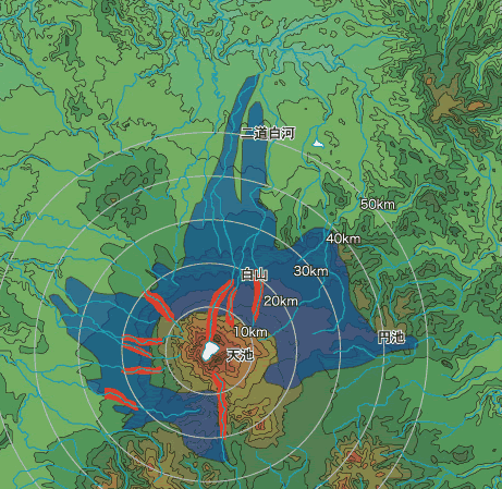 白頭山の10世紀巨大噴火は、周辺に住む人々に、どのような影響を与えたのでしょう。遠く1000㎞離れた日本の北海道から東北地方にも灰を積もらせるほどですから、大きな被害があったことは想像に難くありません。それほどの噴火がなぜ古文書に残されなかったのかについては、その当時の周辺王国の政治的不安定に起因すると考えられますが、もっと簡単な解釈としては、近いところで噴火に遭遇した者は全て火砕流や土石流で命を落とし、記録を残すことができず、また、遠くで噴火を見た者は、全山ばかりでなく周囲一帯をも覆いつくす噴煙の黒雲のなかで、いったい何が起きているのか判断することができなかった、というのが正しいのではないでしょうか。