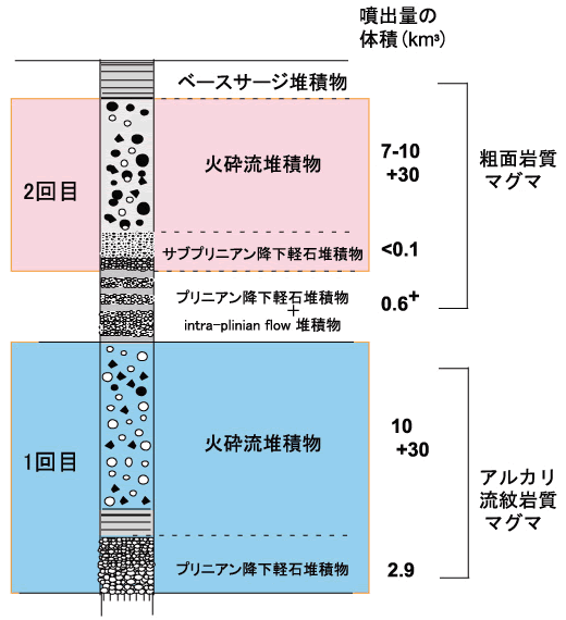 調査研究により、10世紀噴火の総噴出物量は83〜117km3にも及ぶことがわかりました。これは、1991〜1995年の雲仙普賢岳(総噴出量0.25 km3)の総噴出物量の200倍以上にも達します。インドネシア・タンボラ火山の1815年の噴火に次いで、噴出量は有史以降最大級の噴火とされています。