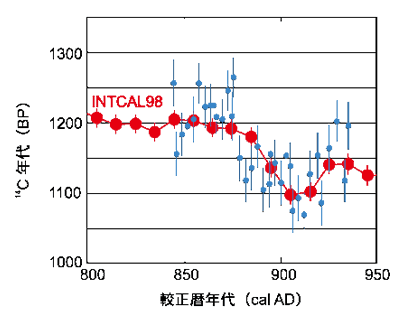 炭化樹木で測定された14C年代値(青)と較正曲線(赤:INTCAL98)との比較。年輪ごとの14Cを求める較正曲線と比較することにより、その樹木がたおれた年代(樹皮部分)を正確に知ることができます。(石塚ほか、2003)
