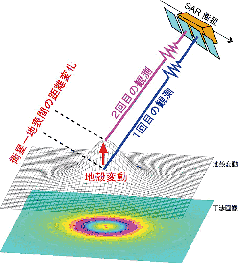 2時期に観測された合成開口レーダー画像の位相差を得る解析手法で、SAR 干渉法、干渉SAR 等と呼ばれます。位相差は2回の観測における人工衛星と地表面との間の距離の差に相当し、観測位置の差、地形による効果などを除去することによって、2回の観測間に生じた地殻変動による距離変化を求めることができます。 (提供:防災科学技術研究所 )