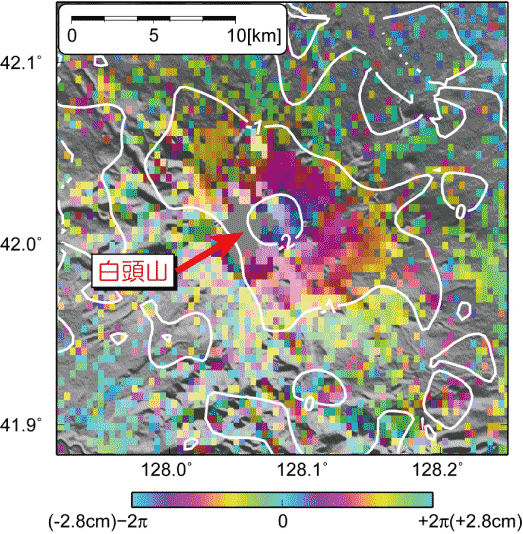 白頭山での活発な地震活動が噴火につながるのかどうかを調べるため、防災科学技術研究所と共同で、衛星に搭載した合成開口レーダーによって撮影した2004年と2005年の画像を用いた解析(SAR 干渉解析)を行ないました。その結果、この1年の間に白頭山の山頂は約2cm隆起していることがわかりました。この隆起量は、より深い場所からマグマが上昇し、地下約5kmの位置に、約0.001km3の量のマグマが蓄えられたとすると説明できます。白頭山における地震や地殻変動はこの観測のもっと前から続いていますので、実際には0.001km3以上のマグマがより地下深部から上昇してきていると推定されます。白頭山の隆起は、中国地震局による現地での測量でも確認されています。