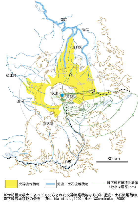 白頭山では、火口から約60km離れた両江付近では厚さ25m以上にも及ぶ土石流堆積物が確認されました。